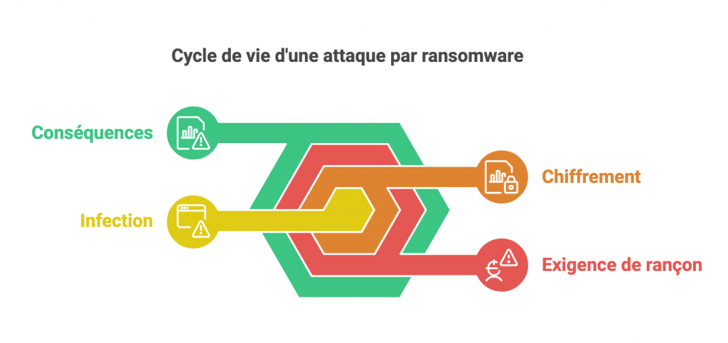 Le fonctionnement d’un ransomware se déroule en plusieurs étapes :